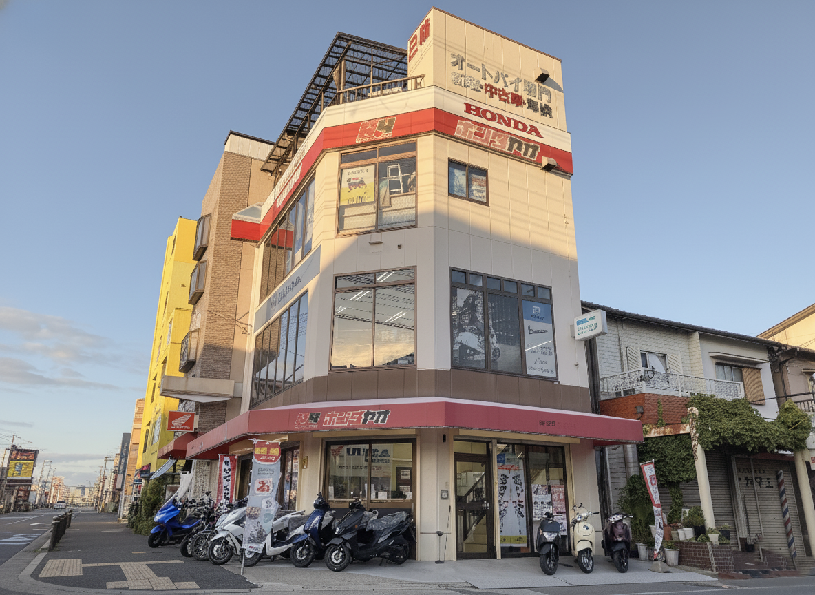 当店は、Honda・スズキを扱う「ホンダヤオ」、またはお洒落なイタリアンスクーターを扱う「ベスパ大阪東」が併設されたショップです。