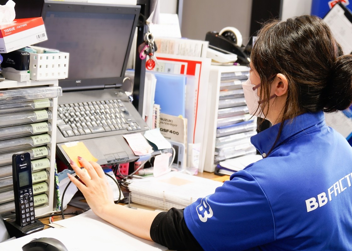 Kさん:主にフロントスタッフになりますが、受付、電話対応、修理や販売のメール対応、登録書類の作成、ご来店された方の接客も行います。メカニックスタッフには、整備に集中してもらえるよう、必要な部品発注も私が担当しています。
