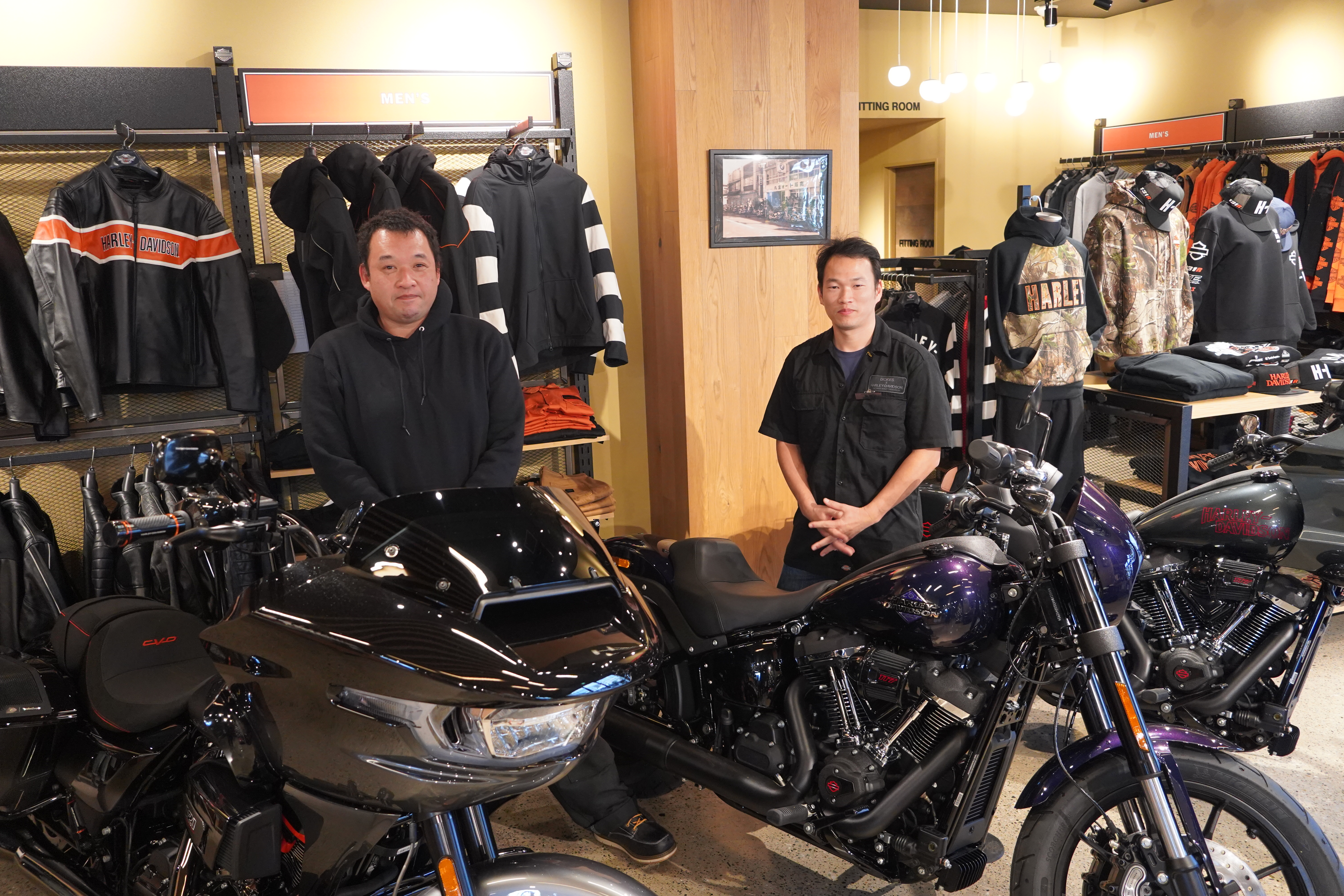 左から。2000年に入社した46歳の吉野さんは、グループの新人研修部門(職業訓練校)の講師などを経験し、現在は車両メーカーや取引銀行との交渉も担当している。以前の丸富オート販売からの経験や組織・課題もすべて掌握している最重要なポジション。現在は軸足をハーレーダビッドソン新横浜におく。二瓶さんは専門学校を卒業後、新卒で入社した35歳。ハーレーダビッドソン、BMW、KTMを経て5年ほど前からハーレーダビッドソン新横浜に勤務する。
