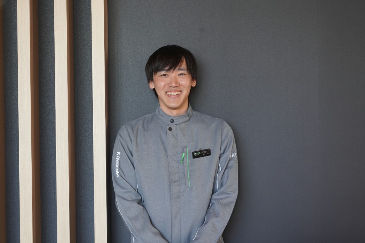 中村さんは、東京工科自動車大学校のハーレーダビッドソン専科を卒業し、20歳の時に新卒で入社した29歳。2019年からカワサキプラザ新横浜のオープニングスタッフとして勤務する。