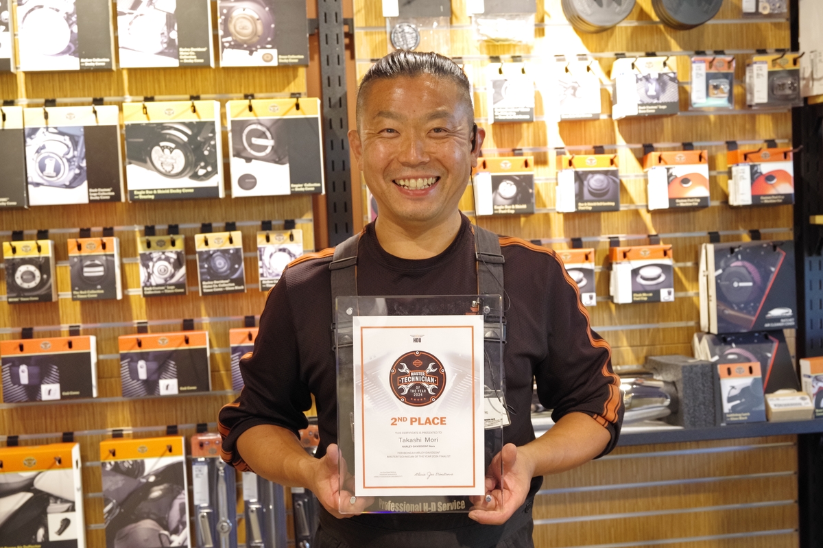 ハーレーのメカニックで最高峰のマスターテクニシャンにして、整備のリーダー“サービスマネージャー”を務める森 貴司さん。2002年に中途入社した50歳だ。2024年、ハーレーダビッドソンの整備士で日本一を決める「マスターテクニシャンオブザイヤーアワード」(MTOYA)で2位を獲得した。愛車はXLCRだ。