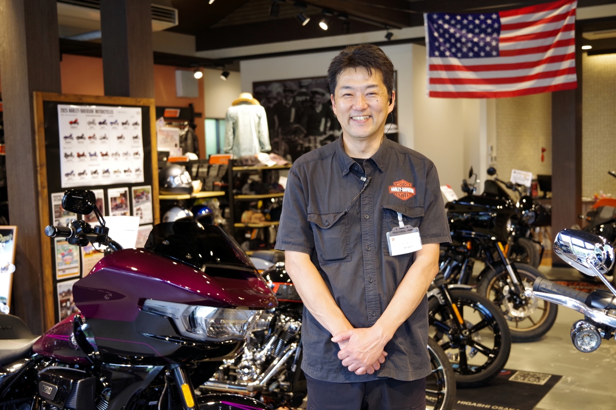 今は入社27年目で、去年から八尾カワサキの副部長に就任しました。ハーレーの正規販売店としての役職はゼネラルマネージャーになり、対外的には八尾カワサキの“ハーレーダビッドソン事業部長”みたいなポストです。店舗マネージャーの上の立場として、ハーレーダビッドソン奈良および東大阪をマネージメントしています。