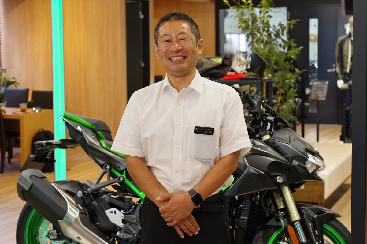 城井仁至さんは2020年7月に入社した45歳。入社2年目でゼネラルマネージャーとなり、カワサキプラザ東大阪の店長を務める。1年を通して、全国のカワサキプラザのお客様からアンケート評価が良かったセールススタッフが選ばれる「ベストコンシェルジュ」の優秀賞を2023年度に受賞。