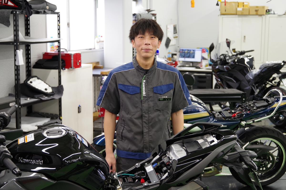 氏本さん:カワサキが好きだったこともあり、カワサキのコースがある整備の専門学校に進学しました。八尾カワサキを知ったのは、専門学校時代に企業説明会に参加した時です。なんとなく東大阪にカワサキとハーレーのショップがあることは知っていましたが、まさか自分がそこで働くことになると思っていませんでした。