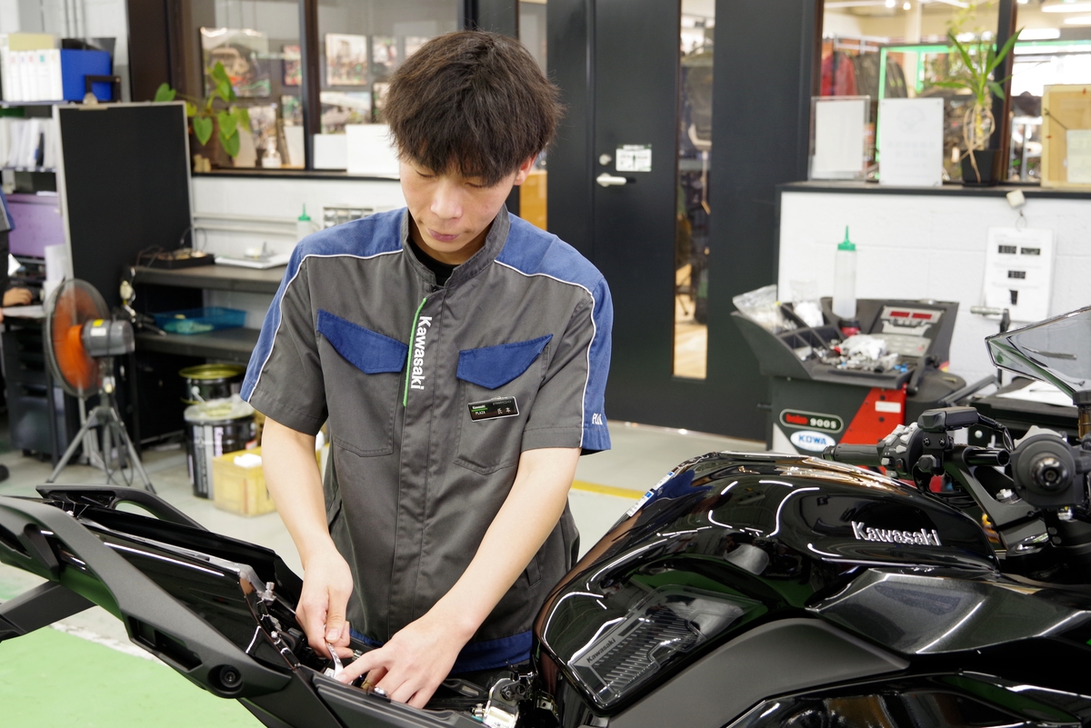 2020年4月入社した氏本悠介さんは大阪出身の25歳。高校卒業後、整備の専門学校に通い、2級整備士の資格を取得した。今は結婚を控えて多忙だが、愛車のNinja400でロングツーリングに出かけるのが趣味。